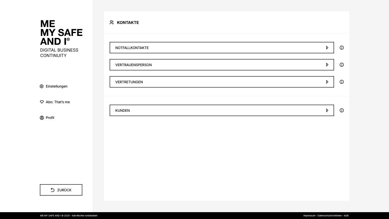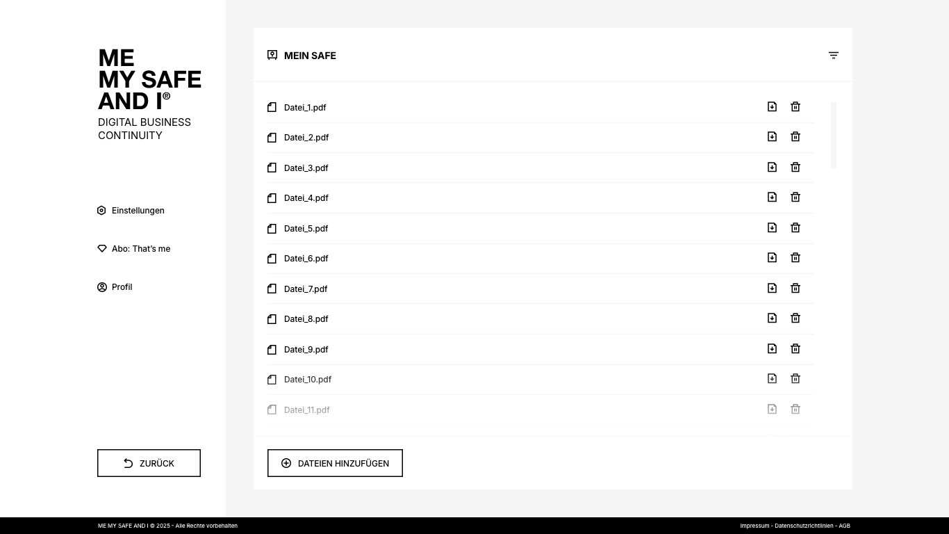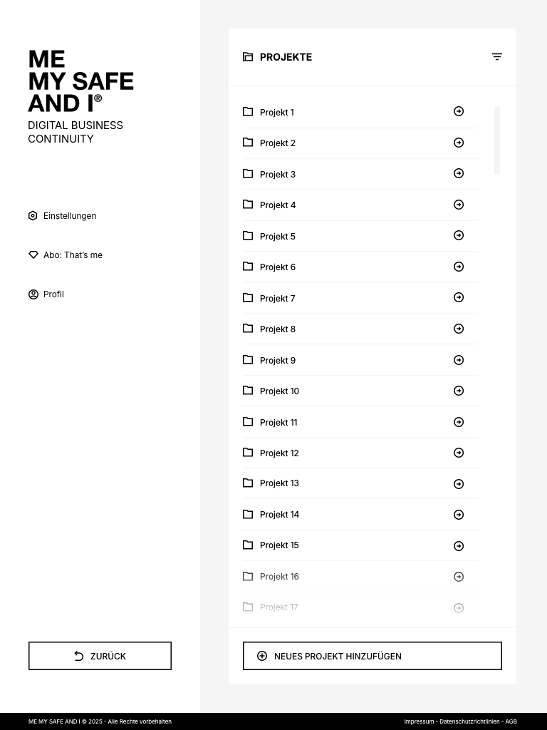 ME, MY SAFE AND I ist die Plattform, mit der du regelst, wie dein Unternehmen weiterläuft, wenn du eine Zeit lang nicht handlungsfähig bist. Du bestimmst, wer Zugang zu deinen Projekten hat, wer sie weiterführen kann, welche Zuständigkeiten gelten und wo wichtige Informationen zu finden sind – und was in welchem Fall zu tun ist.