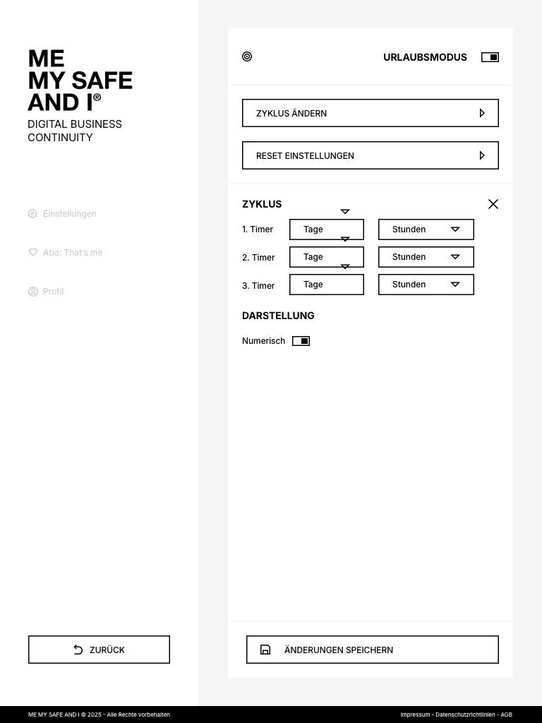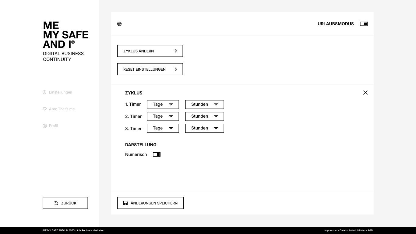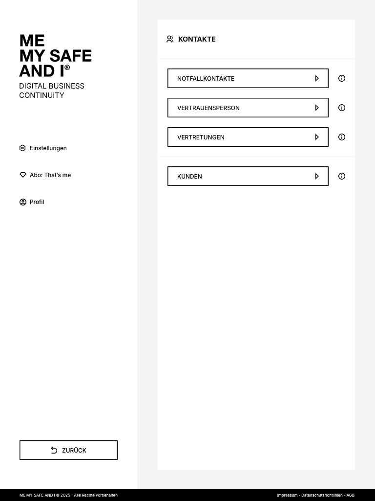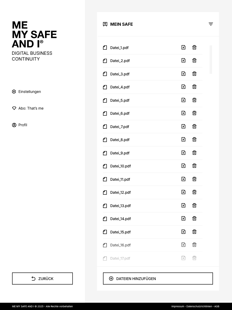 ME, MY SAFE AND I ist die Plattform, mit der du regelst, wie dein Unternehmen weiterläuft, wenn du eine Zeit lang nicht handlungsfähig bist. Du bestimmst, wer Zugang zu deinen Projekten hat, wer sie weiterführen kann, welche Zuständigkeiten gelten und wo wichtige Informationen zu finden sind – und was in welchem Fall zu tun ist.